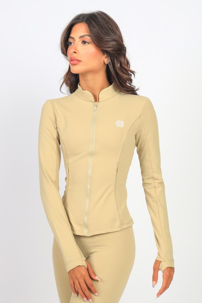 جاكيت رياضي نسائي لون بيج بخامة مطاطية مرنة ناعمة مصنوع من البوليستر والسبانديكس, جاكيت بيج يمنحك راحة كاملة من أول تمرين لآخر خطوة في يومك.